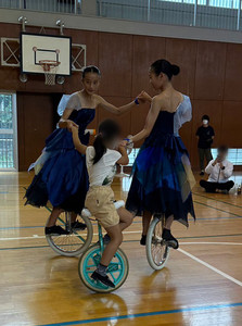 体育館の舞台で一輪車に乗って、演技するのはいつもと感覚が違うのでドキドキ❗️